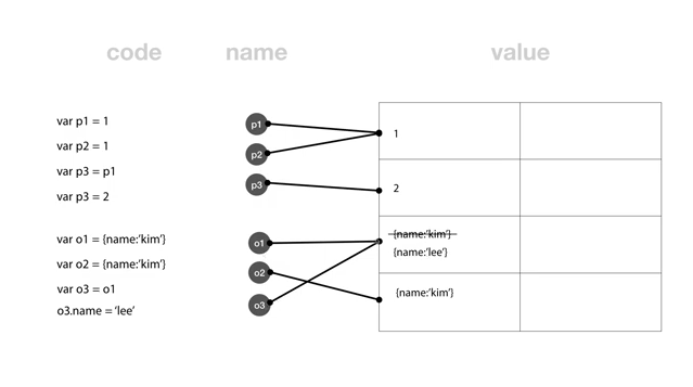 // o1 = o2;`// err: assignment to constant var => 이름을 규제
